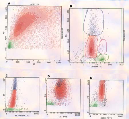 de flujo. Las células leucémicas son muy grandes (alto FS) y muestran alta granularidad (SS) (A: eventos rojos). En el histograma de CD45 versus SS, los promielocitos leucémicos muestran baja densidad de CD45 con un relativamente alto SS (B2: eventos rojos). Las células son característicamente negativas a HLA-DR (C), muestran un patrón heterogéneo de positividad a CD13 (D) y un patrón de tinción homogénea para CD33 (E). |