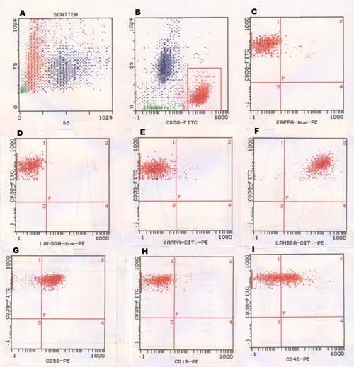 eventos rojos). Las células plasmáticas típicamente expresan CD38 con fuerte intensidad de fluorescencia, lo cual permite identificarlas con confiabilidad (región en color rojo en B). Los histogramas C a I muestran las características fenotípicas de las células plasmáticas de un caso de mieloma múltiple: negatividad a las cadenas Kappa y Lambda de superficie (C y D), expresión monotípica de cadena Lambda citoplasmática (E y F), expresión atípica de CD56 (G), ausencia atípica de CD19 (H) y la negatividad o débil expresión de CD45 (I). |